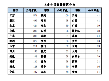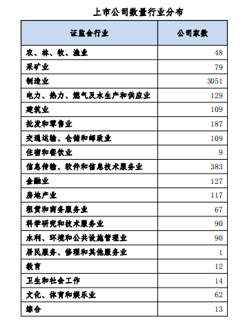 辖区分布看,江苏、浙江、北京境内股票市场上市公司数量超过400家,位列前三甲。在证监会行业类别分布上,制造业3051家,占比近65%,其次是信息传输、软件和信息技术服务业,有383家,占比8.2%。