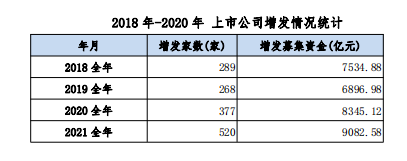 2021年全年共有588个增发预案公告,其中304个为项目融资,主要投向于实体经济,体现了资本市场发挥资本集聚、资源配置支持实体经济的重要作用。全年共有520家公司实际进行增发,募资总额为9082.58亿元。增发公司数量和募资总额均创2018年以来新高。