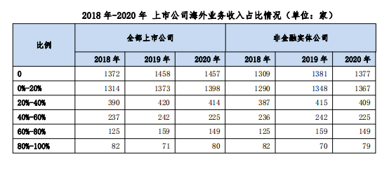 近四成上市公司无(或未披露)海外业务收入,近四成上市公司海外收入占比在20%以下,占比在60%以上和40%以下的公司数量有所增长,呈现哑铃状分布。