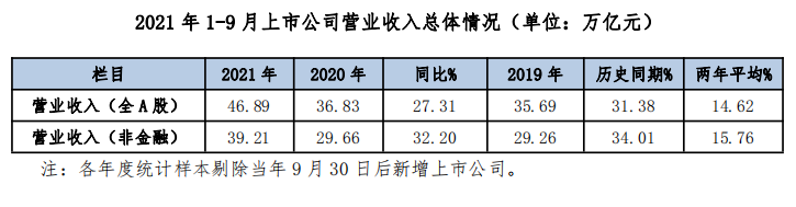 截至 2021年10 月 31 日,除中芯国际外,4,493 家沪深 A 股上市公司按期披露 2021 年前三季度业绩。前三季度,合计实现营业收入46.89 万亿元,同比增长 27.31%,较2019年同期增长31.38%,两年平均14.62%,远高于GDP的两年平均增速(5.2%)。非金融实体类上市公司共实现营收39.21万亿元,同比增长32.20%,较2019年同期增长34.01%,两年平均15.76%。