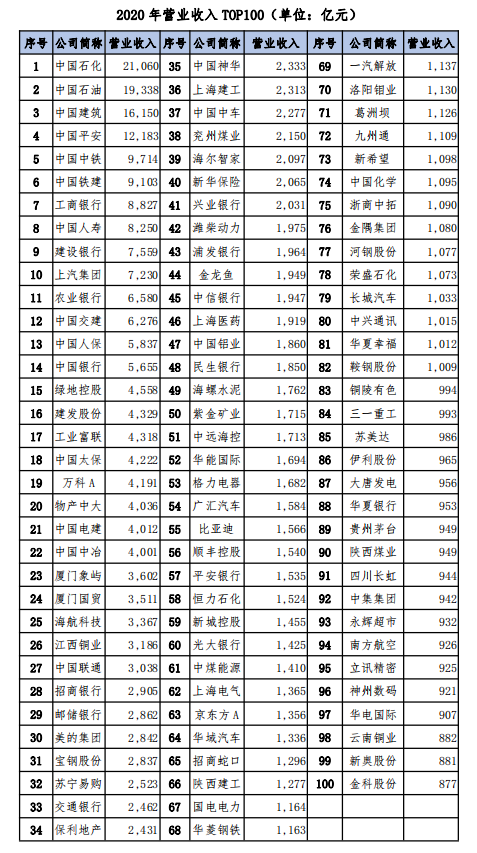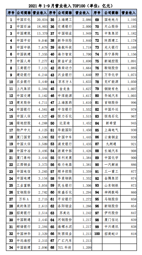 2021年前三季度营业收入前百家公司共实现营业收入26.64万亿元,占全部公司57%。其中万亿以上的三家,分别是中国石化(20,034亿)、中国石油(18,803亿)和中国建筑(13,370亿);中国平安(9,046亿)、中国中铁(7,679亿)、中国铁建(7,355亿)、中国人寿(7,277亿)、工商银行(7,121亿)、建设银行(6,244亿)、农业银行(5,449亿)、上汽集团(5,384亿)、中国交建(5,162亿)九家公司营收在5,000亿以上。