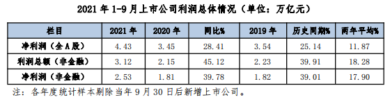 2021年前三季度,除中芯国际外,4,493 家沪深 A 股上市公司合计实现净利润4.43万亿元,同比增长28.41%,较2019年同期增长25.14%,两年平均11.87%。近九成上市公司盈利,超六成公司净利润同比增长,三成上市公司净利润同比增幅超过50%。净利润两年平均增速低于营收近3个百分点。