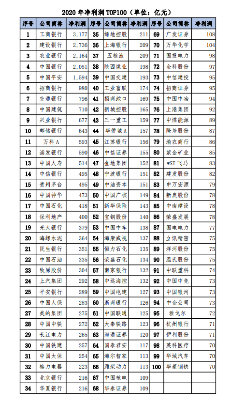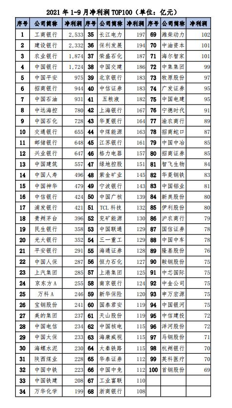 2021年前三季度净利润前百家上市公司共实现净利润2.9万亿元,占全部公司65%。其中净利润超过千亿的公司共有4家,分别是工商银行(2,533亿)、建设银行(2,332亿)、农业银行(1,874亿)、中国银行(1,724亿);中国平安(975亿)、招商银行(944亿)、中国石油(931亿)、中远海控(780亿)、中国石化(728亿)、交通银行(655亿)、邮储银行(648亿)、兴业银行(647亿)、中国建筑(557亿)九家公司净利润在500亿以上。