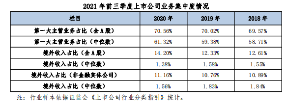 2021年前三季度,上市公司主营业务集中度日趋显著。上市公司第一大主营业务集中度连续三年小幅提升,由69.57%增至70.56%。非金融实体公司境外销售占比各年度接近,2020年较往年略有提高。